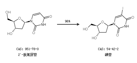 2.通过2''-脱氧尿苷合成碘苷,收率约96%;