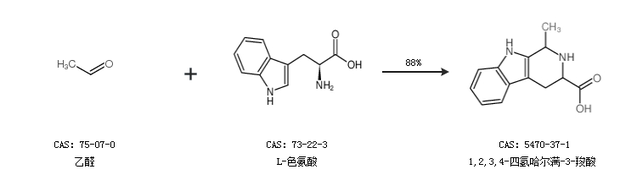 1.通过乙醛和L-色氨酸合成1,2,3,4-四氢哈尔满-3-羧酸,收率约88%;