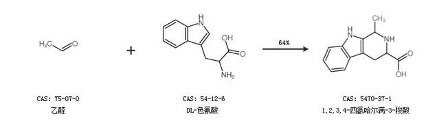 2.通过乙醛和DL-色氨酸合成1,2,3,4-四氢哈尔满-3-羧酸,收率约64%;