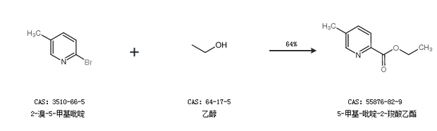 1.通过2-溴-5-甲基吡啶和乙醇合成5-甲基-吡啶-2-羧酸乙酯,收率约64%;
