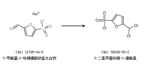 1.通过5-甲酰基-2-呋喃磺酸钠盐水合物合成5-二氯甲基呋喃-2-磺酰氯,收率约78%;