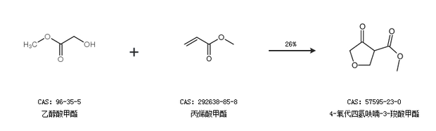 1.通过乙醇酸甲酯和丙烯酸甲酯合成4-氧代四氢呋喃-3-羧酸甲酯,收率约26%;