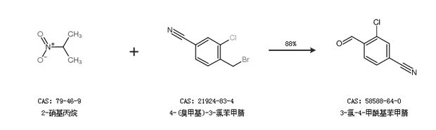1.通过2-硝基丙烷和4-(溴甲基)-3-氯苯甲腈合成3-氯-4-甲酰基苯甲腈,收率约88%;