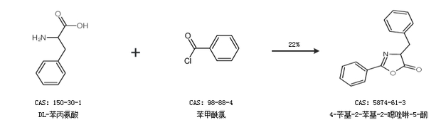 2.通过DL-苯丙氨酸和苯甲酰氯合成4-苄基-2-苯基-2-噁唑啉-5-酮,收率约22%;