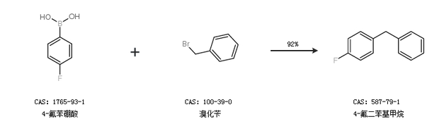 1.通过4-氟苯硼酸和溴化苄合成4-氟二苯基甲烷,收率约92%;