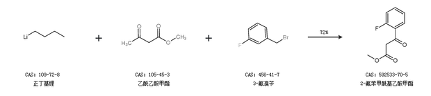 1.通过正丁基锂、乙酰乙酸甲酯和3-氟溴苄合成2-氟苯甲酰基乙酸甲酯,收率约72%;