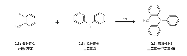 2.通过2-碘代甲苯和二苯基膦合成二苯基(O-甲苯基)膦,收率约73%;