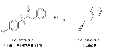 2.通过1-苄基-1-甲苯磺酰甲基异丁酯合成苯乙基乙腈,收率约48%;