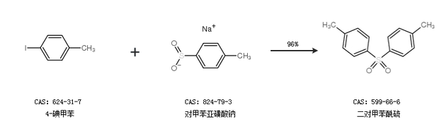 1.通过4-碘甲苯和对甲苯亚磺酸钠合成二对甲苯酰硫,收率约96%;
