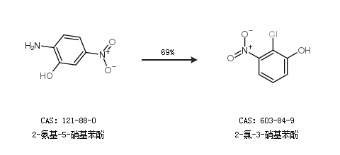 2.通过2-氨基-5-硝基苯酚合成2-氯-3-硝基苯酚,收率约69%;