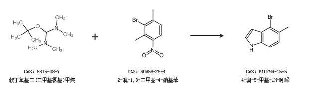 1.通过叔丁氧基二(二甲基氨基)甲烷和2-溴-1,3-二甲基-4-硝基苯合成4-溴-5-甲基-1H-吲哚