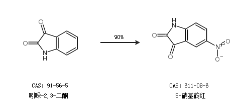 1.通过吲哚-2,3-二酮合成5-硝基靛红,收率约90%;