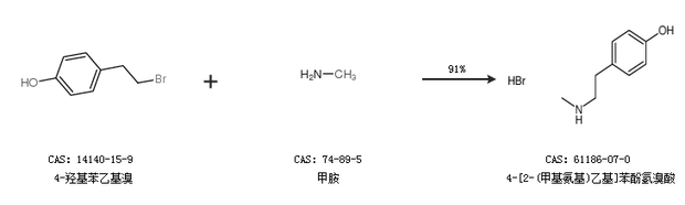 1.通过4-羟基苯乙基溴和甲胺合成4-[2-(甲基氨基)乙基]苯酚氢溴酸,收率约91%;
