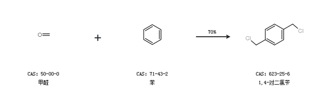 1.通过甲醛和苯合成1,4-对二氯苄,收率约70%;