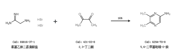 1.通过氨基乙脒二氢溴酸盐和2,3-丁二酮合成5,6-二甲基吡嗪-2-胺,收率约16%;