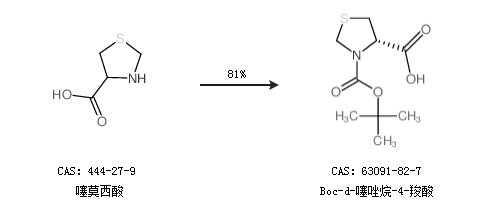 1.通过噻莫西酸合成Boc-d-噻唑烷-4-羧酸,收率约81%;