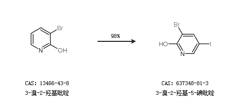 1.通过3-溴-2-羟基吡啶合成3-溴-2-羟基-5-碘吡啶,收率约98%;
