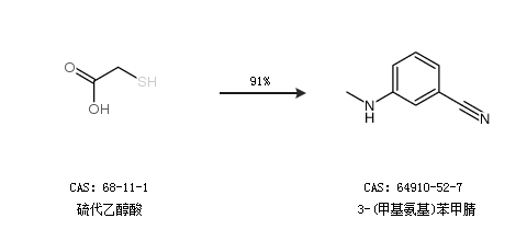 1.通过硫代乙醇酸合成3-(甲基氨基)苯甲腈,收率约91%;