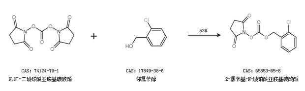 1.通过N,N''-二琥珀酰亚胺基碳酸酯和邻氯苄醇合成2-氯苄基-N-琥珀酰亚胺基碳酸酯,收率约53%;