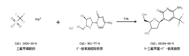 1.通过三氟甲磺酸钠和2''-脱氧胞嘧啶核苷合成5-三氟甲基-2’-脱氧胞苷,收率约73%;