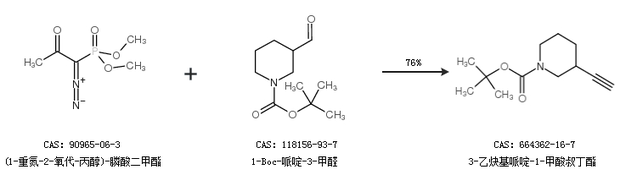 1.通过(1-重氮-2-氧代-丙醇)-膦酸二甲酯和1-Boc-哌啶-3-甲醛合成3-乙炔基哌啶-1-甲酸叔丁酯,收率约76%;