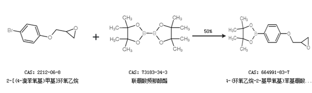 1.通过2-[(4-溴苯氧基)甲基]环氧乙烷和联硼酸频那醇酯合成4-(环氧乙烷-2-基甲氧基)苯基硼酸频哪醇酯,收率约50%;