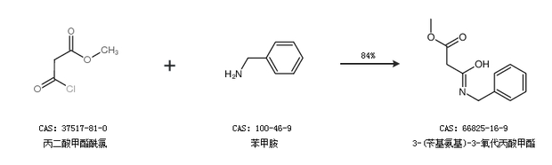 1.通过丙二酸甲酯酰氯和苯甲胺合成3-(苄基氨基)-3-氧代丙酸甲酯,收率约84%;