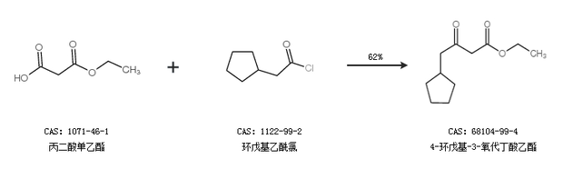 1.通过丙二酸单乙酯和环戊基乙酰氯合成4-环戊基-3-氧代丁酸乙酯,收率约62%;