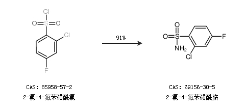 1.通过2-氯-4-氟苯磺酰氯合成2-氯-4-氟苯磺酰胺,收率约91%;