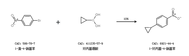 1.通过1-溴-4-硝基苯和环丙基硼酸合成1-环丙基-4-硝基苯,收率约10%;