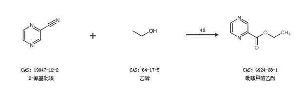 2.通过2-氰基吡嗪和乙醇合成吡嗪甲酸乙酯,收率约4%;