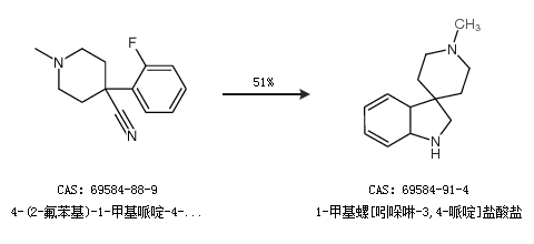 2.通过4-(2-氟苯基)-1-甲基哌啶-4-甲腈合成1-甲基螺[吲哚啉-3,4-哌啶]盐酸盐,收率约51%;