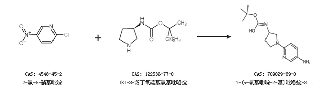 1.通过2-氯-5-硝基吡啶和(R)-3-叔丁氧羰基氨基吡咯烷合成1-(5-氨基吡啶-2-基)吡咯烷-3-氨基甲酸叔丁酯