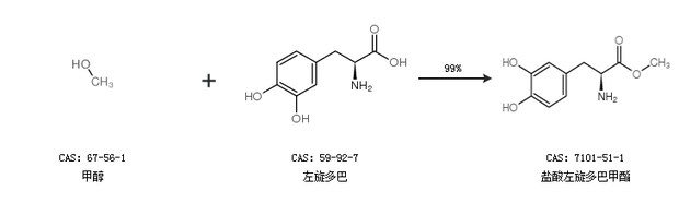 1.通过甲醇和左旋多巴合成盐酸左旋多巴甲酯,收率约99%;