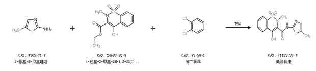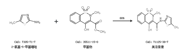 2.通过2-氨基-5-甲基噻唑、4-羟基-2-甲基-2H-1,2-苯并噻嗪-3-甲酸乙酯 1,1-二氧化物和邻二氯苯合成美洛昔康,收率约75%;