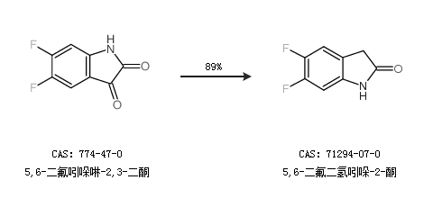 1.通过5,6-二氟吲哚啉-2,3-二酮合成5,6-二氟二氢吲哚-2-酮,收率约89%;