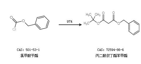 1.通过氯甲酸苄酯合成丙二酸叔丁酯苯甲酯,收率约97%;