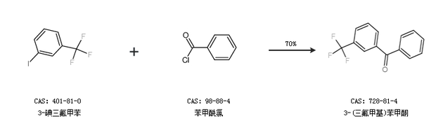 2.通过3-碘三氟甲苯和苯甲酰氯合成3-(三氟甲基)苯甲酮,收率约70%;