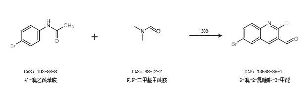 2.通过4''-溴乙酰苯胺和N,N-二甲基甲酰胺合成6-溴-2-氯喹啉-3-甲醛,收率约30%;