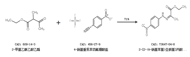 1.通过2-甲基乙酰乙酸乙酯和4-硝基重氮苯四氟硼酸盐合成2-[2-(4-硝基苯基)亚肼基]丙酸乙酯,收率约71%;
