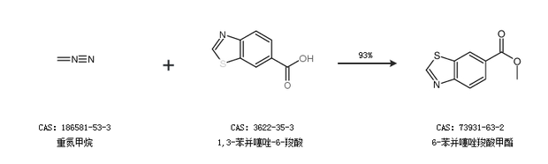 2.通过重氮甲烷和1,3-苯并噻唑-6-羧酸合成6-苯并噻唑羧酸甲酯,收率约93%;