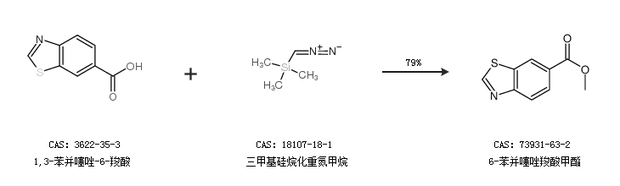 1.通过1,3-苯并噻唑-6-羧酸和三甲基硅烷化重氮甲烷合成6-苯并噻唑羧酸甲酯,收率约79%;