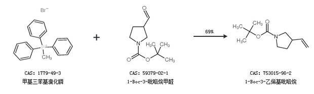 1.通过甲基三苯基溴化膦和1-Boc-3-吡咯烷甲醛合成1-Boc-3-乙烯基吡咯烷,收率约69%;