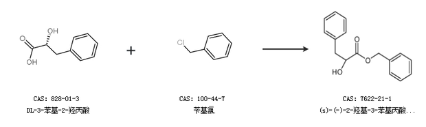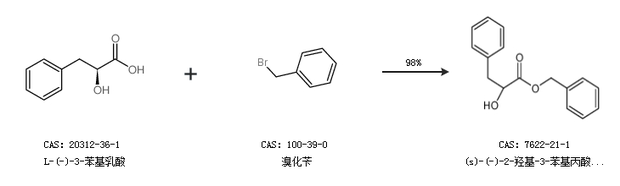 1.通过L-(-)-3-苯基乳酸和溴化苄合成(s)-(-)-2-羟基-3-苯基丙酸苄酯,收率约98%;