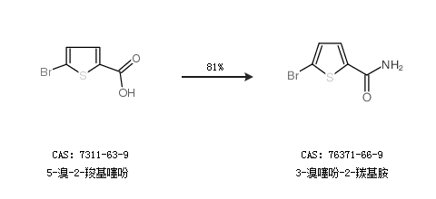 1.通过5-溴-2-羧基噻吩合成3-溴噻吩-2-羰基胺,收率约81%;