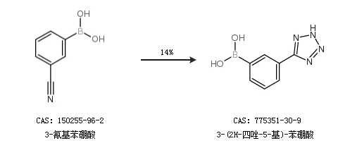 1.通过3-氰基苯硼酸合成3-(2H-四唑-5-基)-苯硼酸,收率约14%;