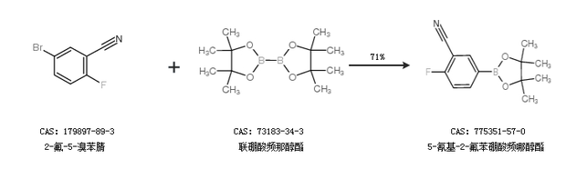 1.通过2-氟-5-溴苯腈和联硼酸频那醇酯合成5-氰基-2-氟苯硼酸频哪醇酯,收率约71%;