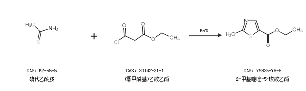 1.通过硫代乙酰胺和(氯甲酰基)乙酸乙酯合成2-甲基噻唑-5-羧酸乙酯,收率约65%;