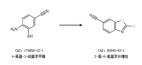 2.通过4-氨基-3-疏基苯甲腈合成2-氯-6-氰基苯并噻唑