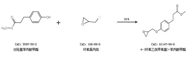 1.通过对羟基苯丙酸甲酯和环氧氯丙烷合成4-(环氧乙烷甲氧基)-苯丙酸甲酯,收率约81%;